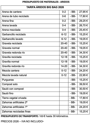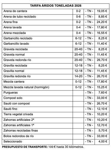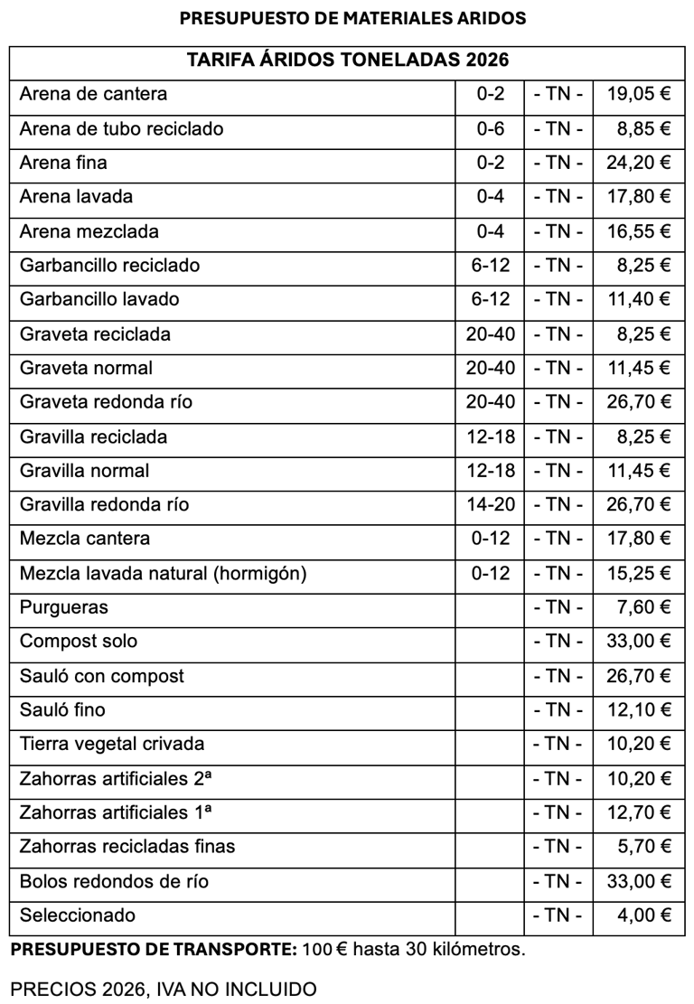 LISTADO DE PRECIOS ÁRIDOS - MATERIALES DE CONSTRUCCIÓN